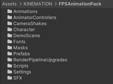 All the assets' contents, such as animations, meshes, sounds, and prefabs can be found in <mark style="background-color:purple;">**KINEMATION → FPSAnimationPack**</mark>:
